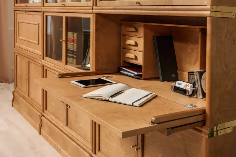 Hyllyyn voit yhdistää myös baarikaapin tai sekretäärin, eli työpisteen laatikoineen.